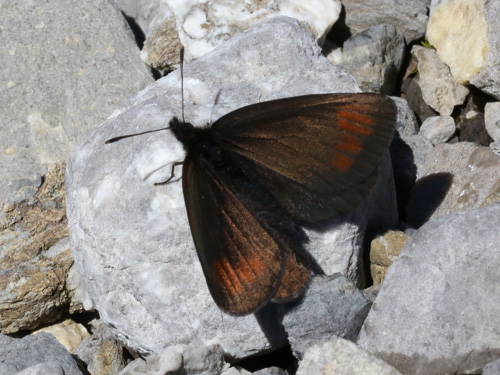 This is a really dark butterfly that characteristically flies over screes or areas dominated by rocks at high altitudes. It is very local and I've not seen it very often. It is also difficult to approach, being very sensitive to shadow and dark approaching lepster shaped silhouettes. Usually it is encountered at high altitudes although the books say it can be found below 2000m.